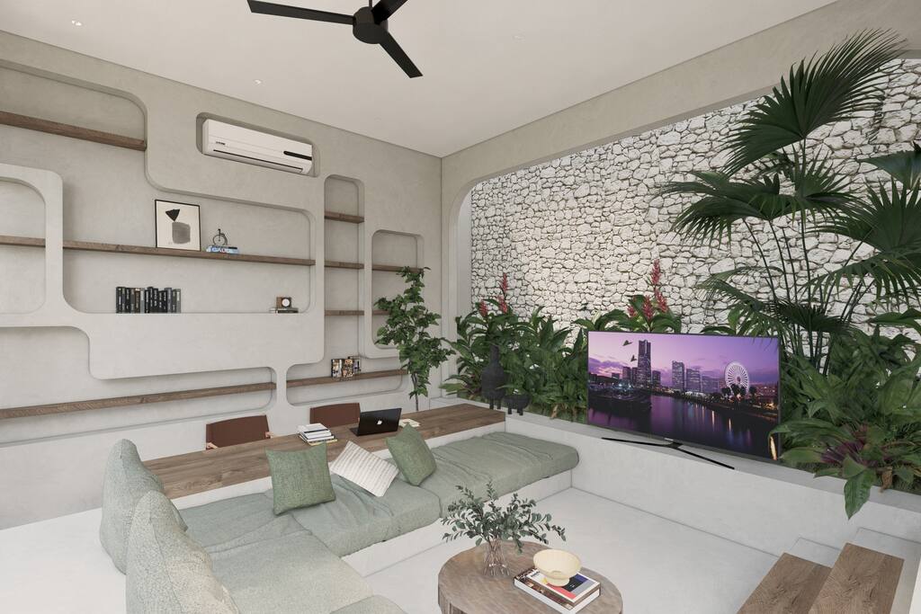 This 200 m² villa blends modern bohemian style with tropical living. Inside, 130 m² of open space with high ceilings, natural light, and greenery views create a calm atmosphere. • 1 bedroom with a king bed • 1 ensuite (tub + shower) + 1 guest bathroom • 24 m² private pool • AC in the bedroom and the living room; Smart TV • Full kitchen: gas hob, fridge, cookware • Dedicated workspace (sunken desk) • Fully private; high ceilings and green views • Tropical Rooftop Lounge